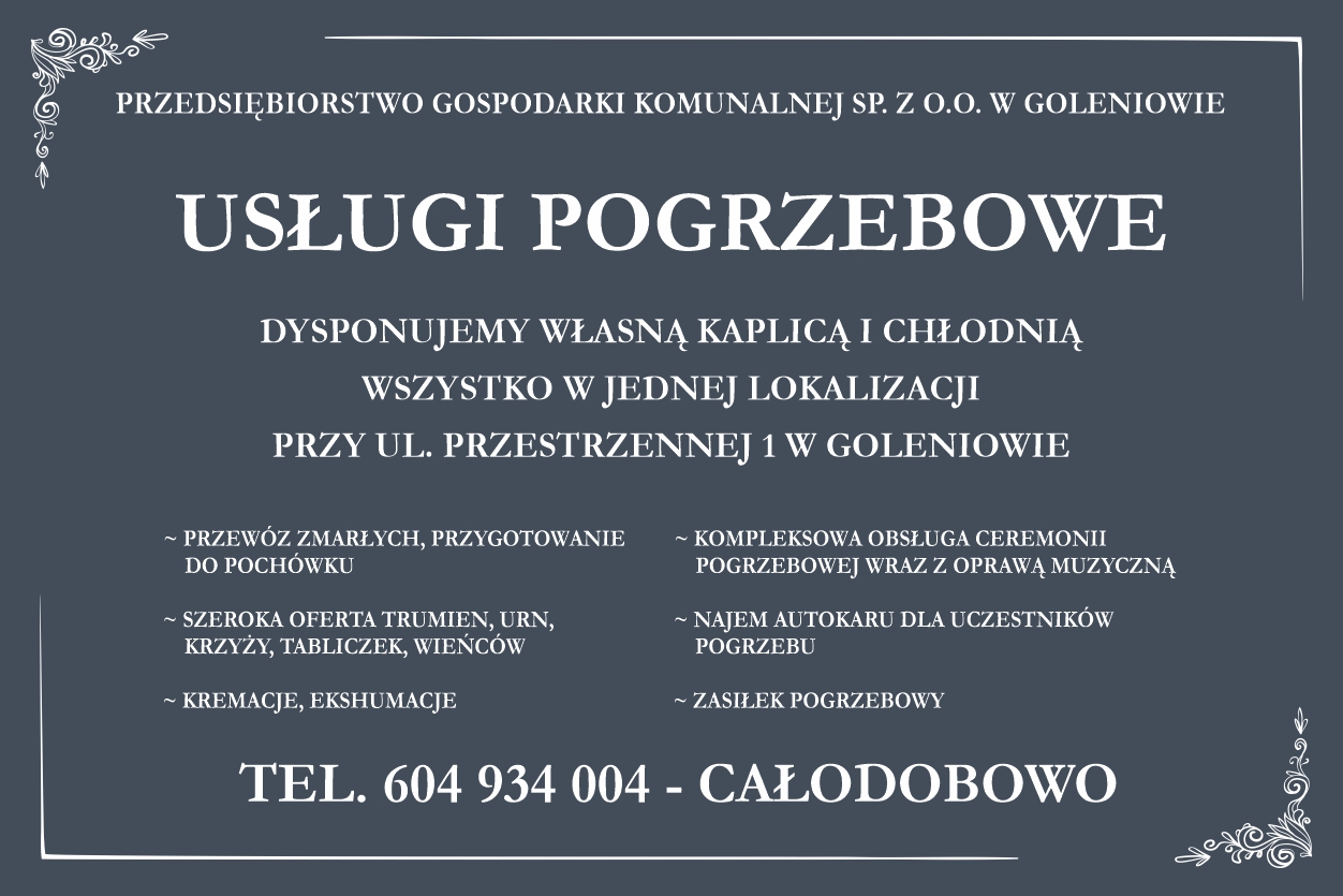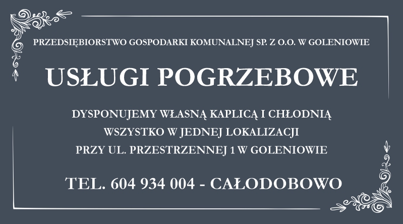 Spółka posiada własny Dom Pogrzebowy z salą ceremonialną i chłodnią do przechowywania zmarłych na cmentarzu komunalnym w Goleniowie przy ulicy Przestrzennej. Dysponujemy również wysokiej klasy sprzętem pogrzebowym.
