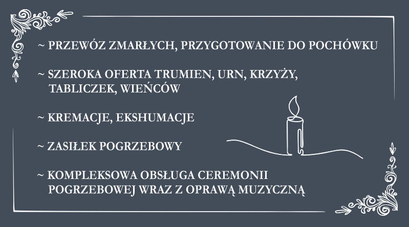 - Szeroki wybór akcesoriów pogrzebowych (odzież, trumny, obudowy, krzyże, tabliczki i wieńce z szarfami);