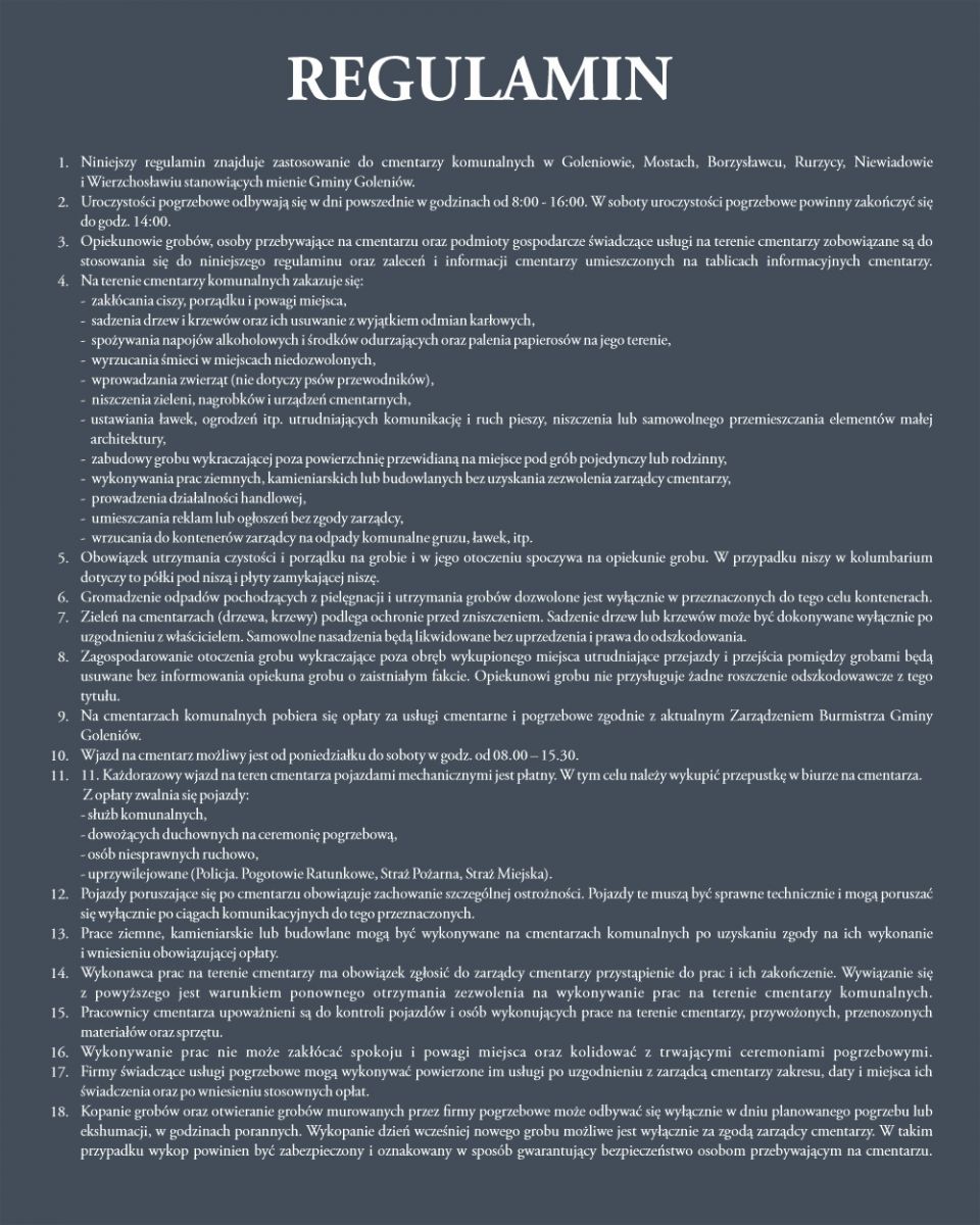 Mieszkańcy miasta i gminy Goleniów, mający groby ziemne na Cmentarzach Komunalnych, wnoszą opłatę za miejsce pod grób na okres 20 lat . Po upływie tego terminu, chcąc zachować prawo do grobu należy dokonać ponownej opłaty na okres następnych 20 lat. W przypadku nie wniesienia obowiązującej opłaty grób może być zlikwidowany.